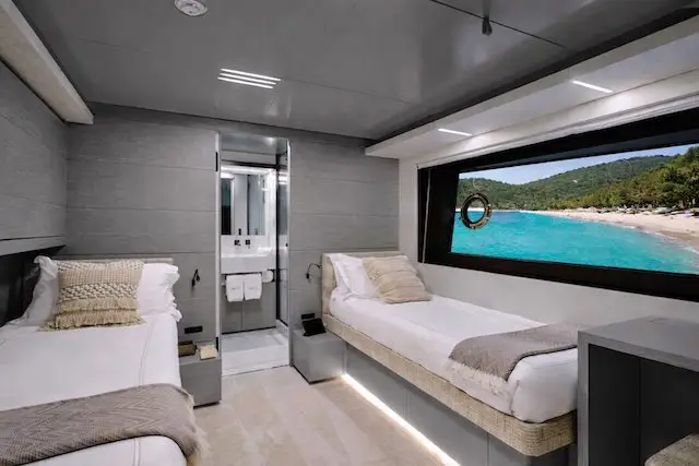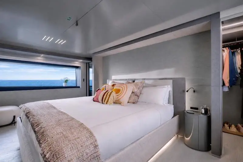 Les intérieurs lumineux révèlent une atmosphère raffinée, où matières et volumes s’accordent avec harmonie. Cinq cabines accueillent 11 invités dans un confort absolu, tandis que les espaces extérieurs ont été pensés pour savourer chaque instant en mer, du lever du soleil aux soirées au mouillage.